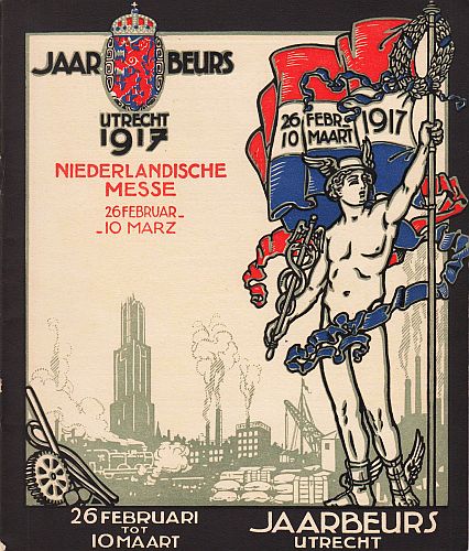 17. JAARBEURS Die erste Niederländische Jahrmesse in Utrecht. 26 Februar – 10 März 1917. Utrecht, [Algemeen Secretariaat van de Jaarbeurs], 1917. 24 x 20 cm. Geniet. 28 p. Rijk geïllustreerd. Met prachtige kleurenreproductie van het door Lion Cachet ontworpen (in paars, rood en oranje). Achterop een kaart van Nederland (met rode pijl naar Utrecht!). 1e druk. Goed exemplaar.