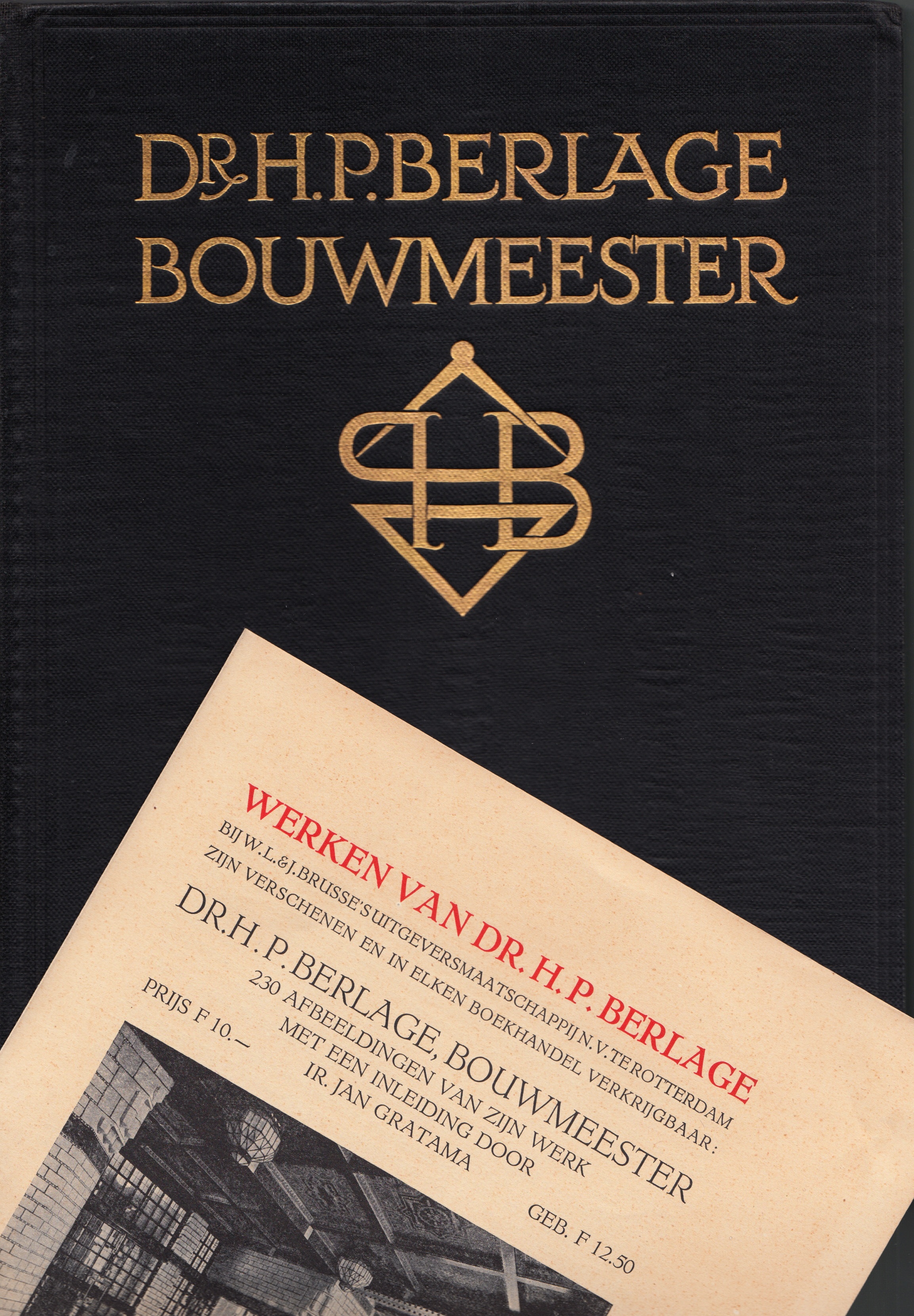 1. (BERLAGE, H.P.). GRATAMA, Jan Dr. H.P. Berlage, bouwmeester. 230 afbeeldingen van zijn werk met een inleiding door ir. Jan Gratama. Rotterdam, W.L. & J. Brusse, 1925. 25 x 19 cm. Versierd linnen (S.H. de Roos). (48), 188 p. Geïllustreerd. Gezet uit de Hollandsche Mediaeval. 1e druk. Voorin een schoolstempel, maar verder een mooi en fris exemplaar met gave goudopdruk.