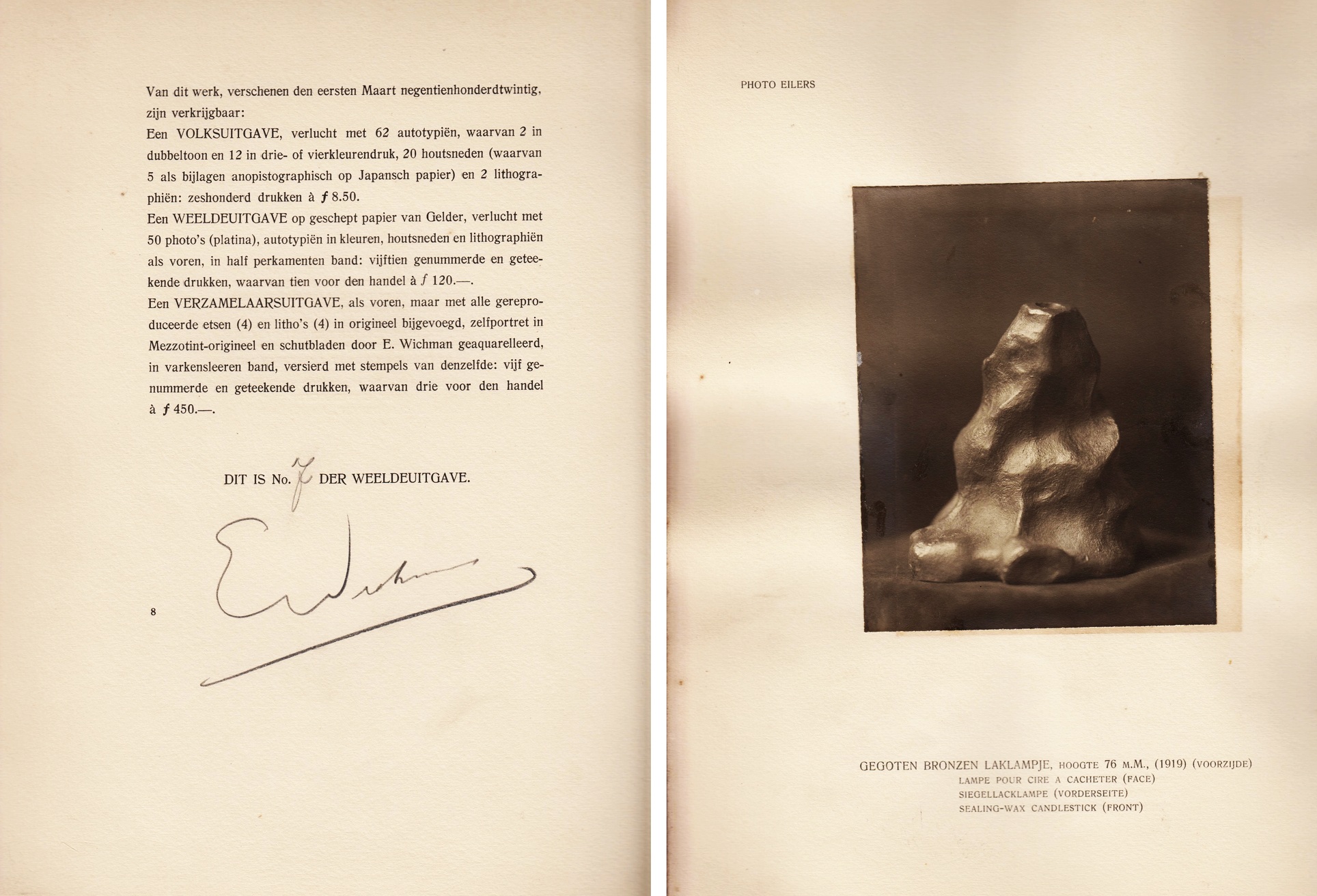 * Een van de 15 door Wichman genummerde en gesigneerde exemplaren van de Weeldeuitgave. Deze luxe-exemplaren zijn gedrukt op geschept papier van Van Gelder en verlucht met 50 originele platinafoto’s, ‘autotypiëen in kleuren’, houtsneden en litho’s (alle ingeplakt). Volgens het colofon zou de Weeldeuitgave in halfperkament gebonden zijn, maar dat is bij dit exemplaar niet het geval.