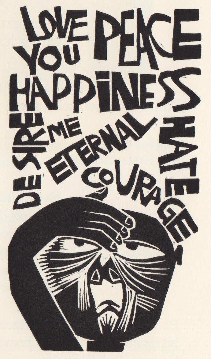 6. VANDELOO, Jos Splitter haben scharfe Kanten. Mit einem originalholzschnitt von Frans Masereel und acht Linolschnitten von Paul Peter Piech. Oxford, Mouette Press, 1974. Ingenaaid. 16 p. Gedrukt in een oplage van 126 genummerde exemplaren (eigenlijk 252 exemplaren: er verscheen tegelijkertijd een Nederlandstalige uitgave in gelijke uitvoering onder de titel Schilfers hebben scherpe kanten). 1e druk.
