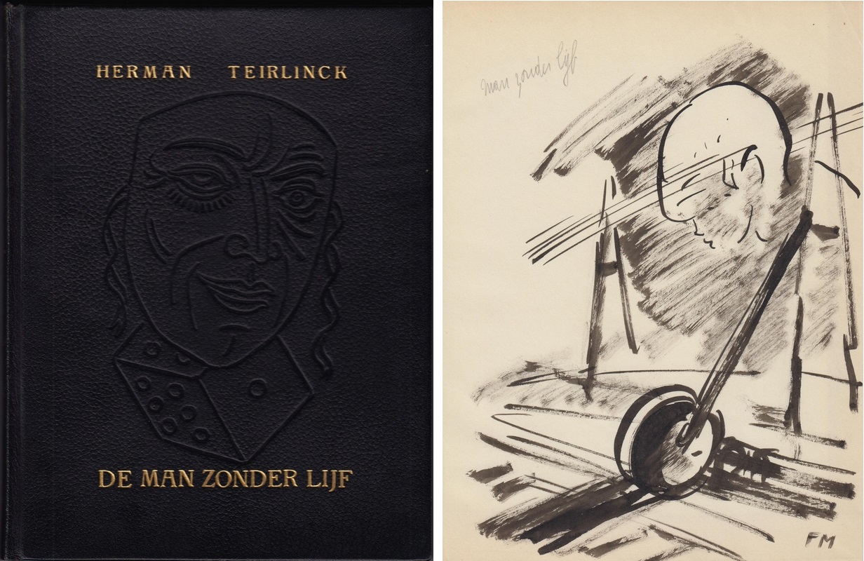 5. TEIRLINCK, Herman De man zonder lijf. (Met acht houtsneden van Frans Masereel, waarvan vijf paginagroot). Antwerpen, De Sikkel, 1938. Verguld zwart heelleder met blinddrukversiering op voor- en achterplat. Kop verguld. 72 p. Gedrukt in een oplage van 700 genummerde exemplaren. Ondanks enkele minieme krasjes op de rug een zeer fraai exemplaar.