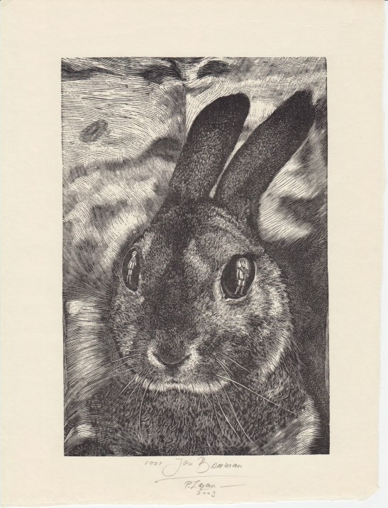 * Eén van de 25 door de auteur gesigneerde luxe-exemplaren met een extra afdruk van het frontispice, een fantastische, gesigneerde houtgravure op Keizerlijk Japans van een haas op groot formaat. Zowel auteur als kunstenaar lieten hun signatuur voorafgaan door een opdrachtje: ‘voor Jan Bouman’. C.O. Jellema overleed slechts een maand na het verschijnen van deze prachtige uitgave.