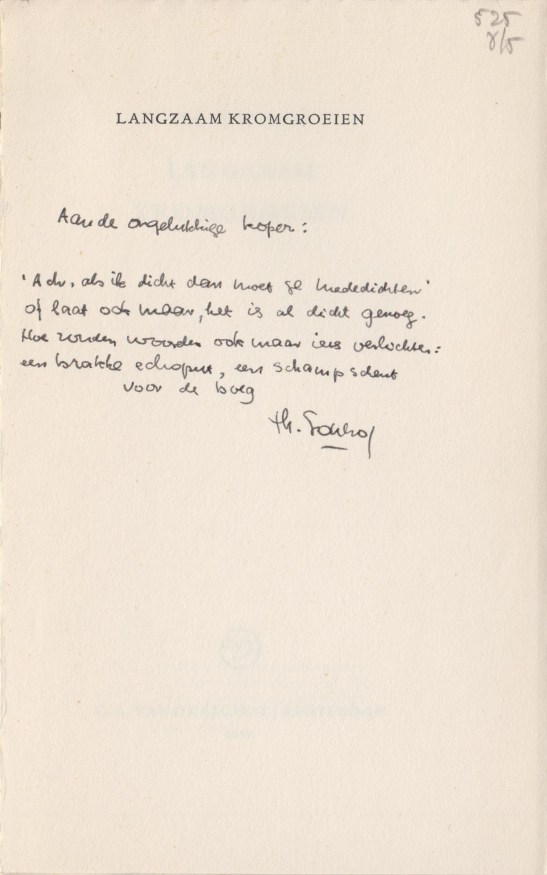 2. SONTROP, Th.A. Langzaam krom groeien. Amsterdam, G.A. van Oorschot, 1962. Ingenaaid. 40 p. Niet afgesneden. Niet opengesneden (!). 1e druk.