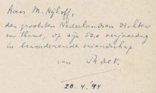 * Opdracht van de auteur op de Franse titel: ‘Aan M. Nijhoff,/ den grootsten Nederlandsen dichter/ van thans, op zijn 50-e verjaardag/ in bewonderende vriendschap/ van Th de V./ 20.4.’44’.