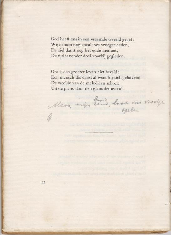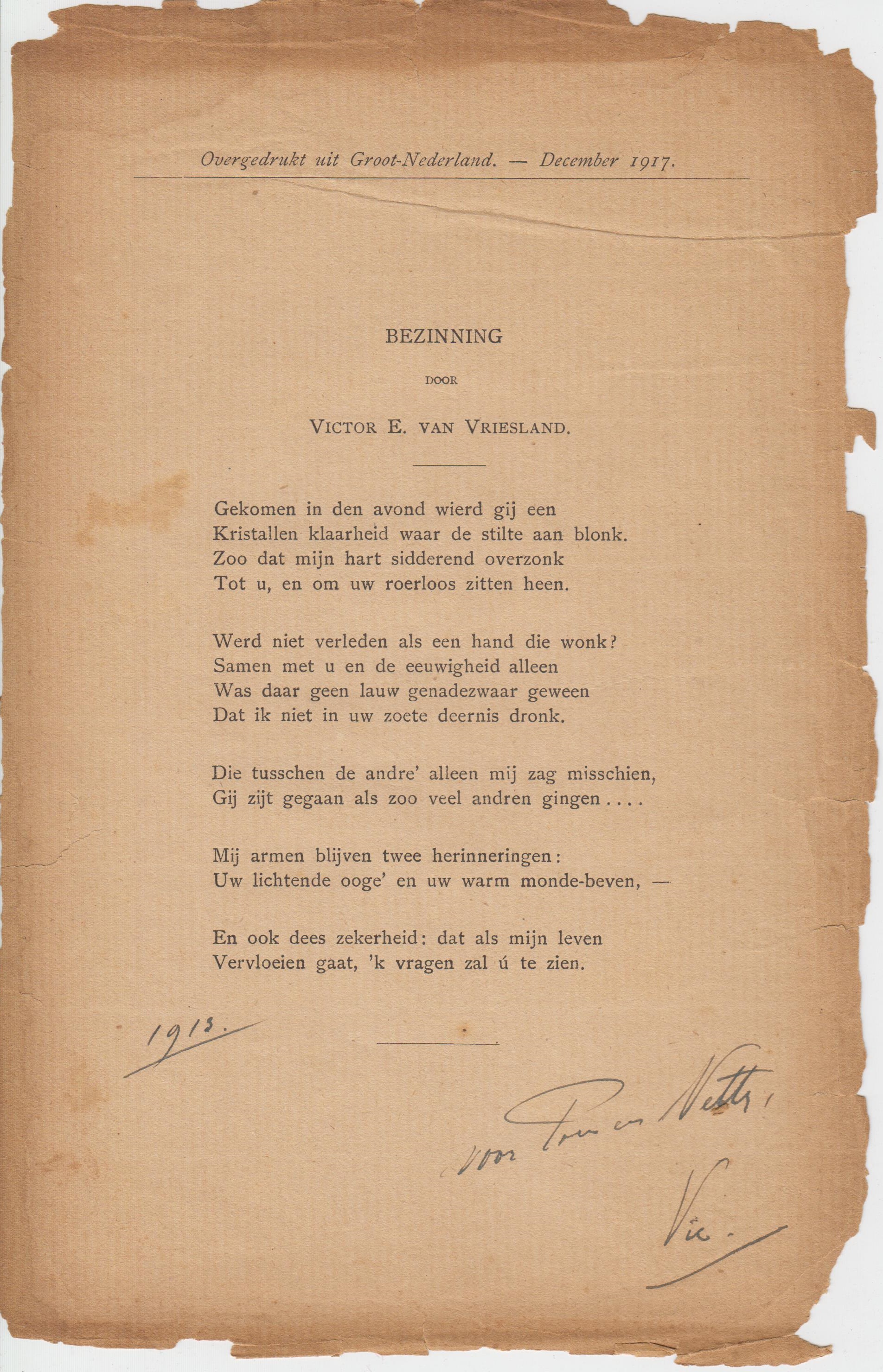 * Opdracht van de auteur op het omslag: ‘aan Martinus Nijhoff/ van/ Victor -/ “You will understand.”/ Oscar Wilde./ 17-12-’11’. In handschrift van Van Vriesland, in de tiende regel, een correctie. Allereerste publicatie van Van Vriesland.
