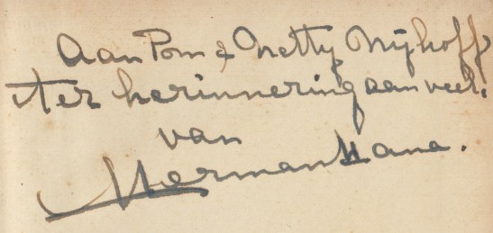 * Opdracht van de auteur op het schutblad: ‘Aan Pom & Netty Nijhoff/ ter herinnering aan veel./ van/ Herman Hana’.