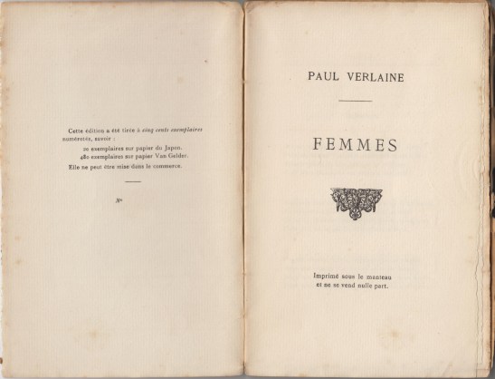 132 VERLAINE, Paul Femmes. ‘Imprimé sous le manteau et ne se vend nulle part’ [= Zonder plaats, Gaucher, 1904]. Ingenaaid. 72 p. Niet afgesneden. Gedrukt in een oplage van 500 genummerde exemplaren. [4e druk]. Voorzijde omslag ontbreekt, rug beschadigd.