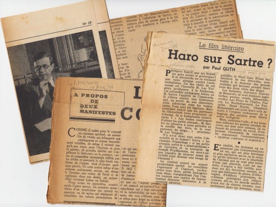 Vier krantenknipsels over Sartre, met titels en dateringen in handschrift van Nijhoff.