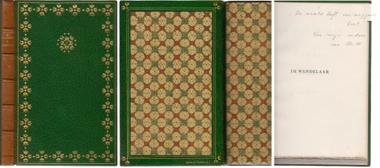 * Eén van de 150 genummerde luxe-exemplaren, gedrukt op Ingres. Dit is bovendien één van de 25 Romeins genummerde exemplaren, gebonden met een leren rug, die ter beschikking bleven van de uitgever. De Jong 355.