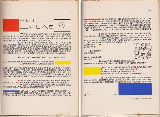 * One of the highlights in twentieth century book design. This edition, from illustration to exclamation mark, was hand-drawn by Bart van der Leck, in his typically angular, geometric style (‘De Stijl’). Text and image are alternated by lines and squares in the primary colors blue, yellow and red.