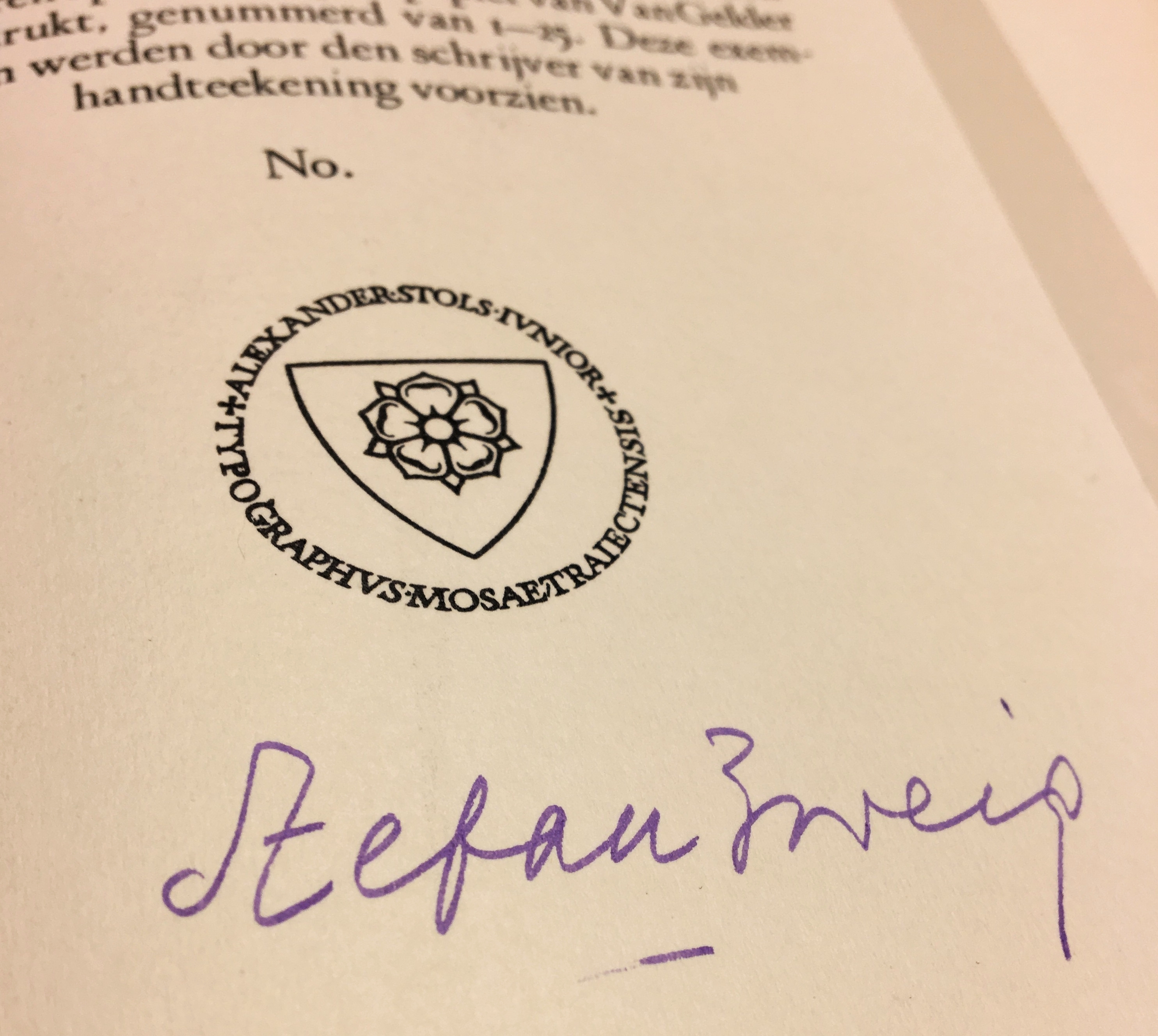 * Exil edition: Zweig was a refugee in London. The first edition in German was published in Vienna 1934, for Germany was impossible. This is one of 25 numbered copies on Simili Japon. It has not been numbered, but it is signed by Zweig under the colophon. This book (the ordinary edition) was not a success – only 237 copies were sold in three years. Thereafter it was taken over by another publisher, but it is unclear what happened to the remaining copies, probably they were ditched. Triomf en tragiek ever was a scarce book. Van Dijk 337.