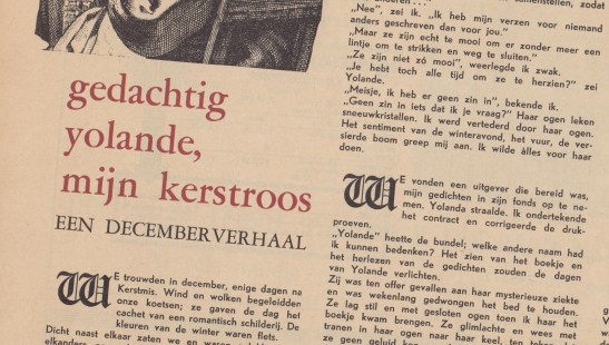 16. BROUWERS, Jeroen ‘Gedachtig Yolande, mijn kerstroos. Een decemberverhaal’. P. 16 in: Salvo. Katholiek tijdschrift voor de Nederlandse strijdkrachten, jaargang 16, kerstnummer, (december 1963). [Den Haag, Hoofdbureau Katholiek Thuisfront], 1963. Gevouwen. 16 p. Geïllustreerd.