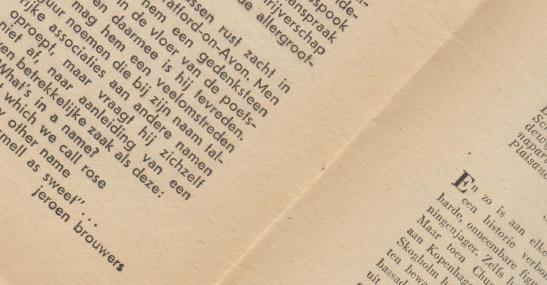 4. BROUWERS, Jeroen ‘Shakespeare: vervalser of genie’. P. 2 in: Salvo. Katholiek weekblad voor de Nederlandse strijdkrachten, jaargang 13, aflevering 39, (27 juni 1960). [Den Haag, Hoofdbureau Katholiek Thuisfront], 1960. Gevouwen. 8 p. Geïllustreerd.
