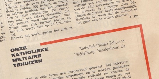 10. BROUWERS, Jeroen ‘Pauselijke soldaten in opspraak’. P. 2 in: Salvo. Katholiek weekblad voor de Nederlandse strijdkrachten, jaargang 14, aflevering 30, (24 april 1961). [Den Haag, Hoofdbureau Katholiek Thuisfront], 1961. Gevouwen. 8 p. Geïllustreerd.