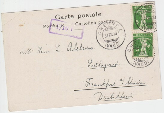 En: Ansichtkaart ‘Chernex – Vue générale’. 9,0 x 14,0 cm. Met in het handschrift van Leopold Aletrino: ’20 Mei/Juni/Juli 10./ 1910′, de tijd die hij bij zijn oom doorbracht.