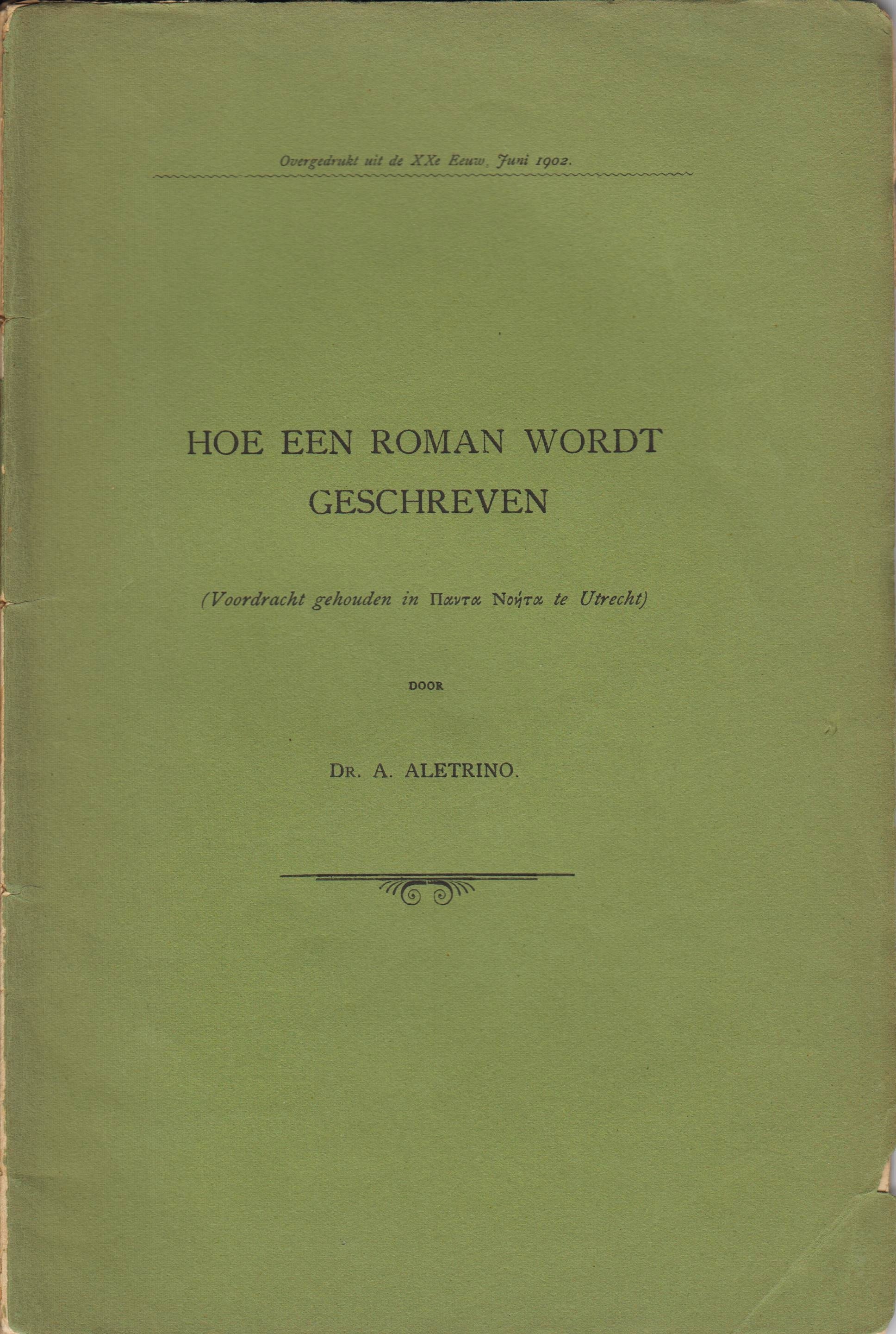 6. ALETRINO, A. Hoe een roman wordt geschreven. Voordracht gehouden in Panta Noèta te Utrecht. Zonder plaats, zonder uitgever, 1902. Apart gepagineerde overdruk uit De XXe Eeuw, juni 1902, p. 702-745. Ingenaaid. 44 p. Rug beschadigd, katernen los.