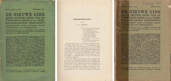 22. ALETRINO, A. Verloving. Overdruk uit De Nieuwe Gids [maart 1912]. Met groen omslag waarop gedrukt ‘Overgedrukt uit de “De Nieuwe Gids” en speciaal gepagineerd 1-33. Ingenaaid. 34 p. Voorzijde omslag los.
