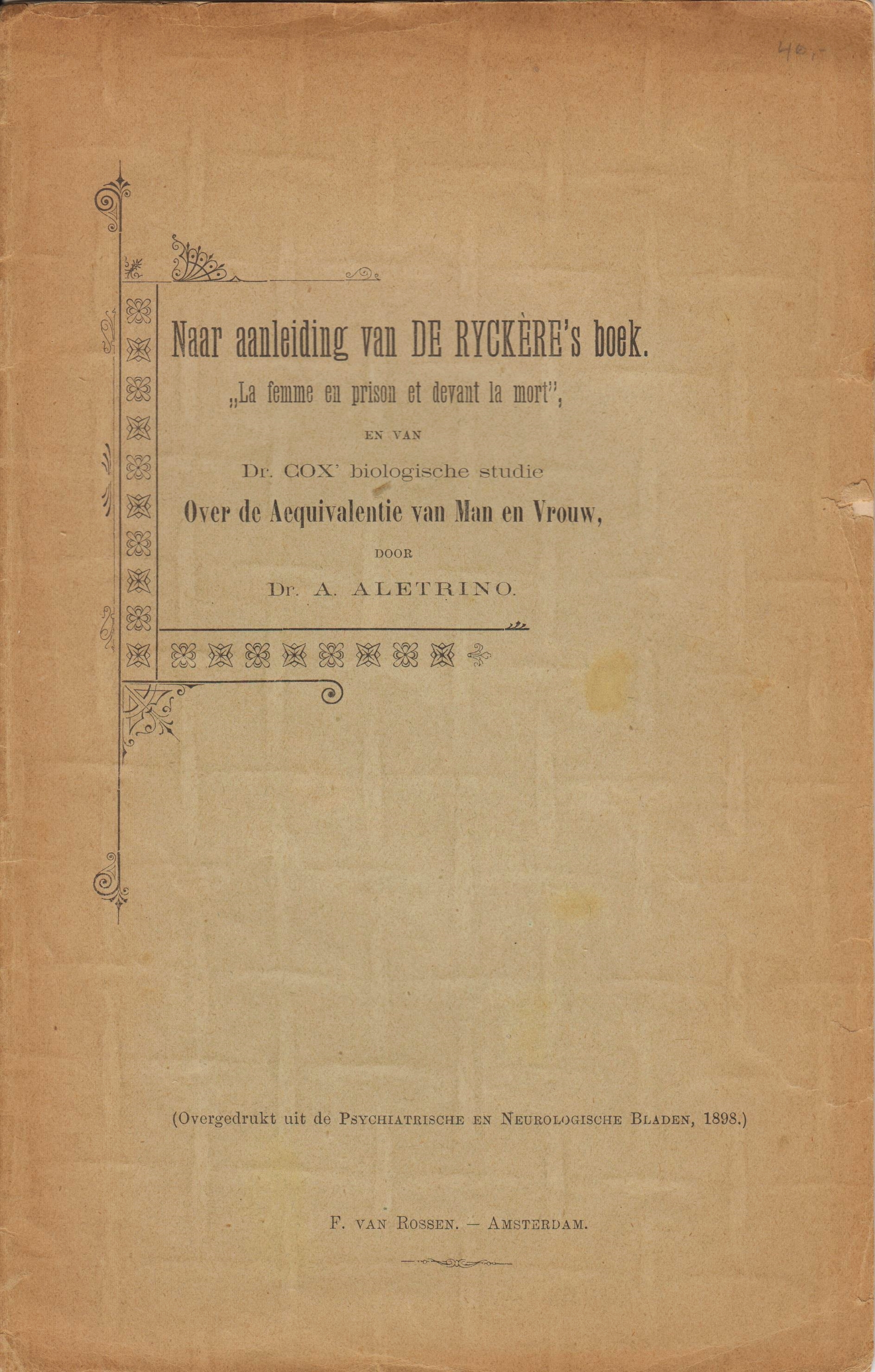 12. ALETRINO, A. Naar aanleiding van De Ryckère’s boek “La femme en prison et devant la mort”, en van Dr. Cox’ biologische studie Over de aequivalentie van man en vrouw. Amsterdam, Van Rossen, 1898. Geniet. 24 p. Voor- en achterzijde omslag los. Stempel op eerste pagina.