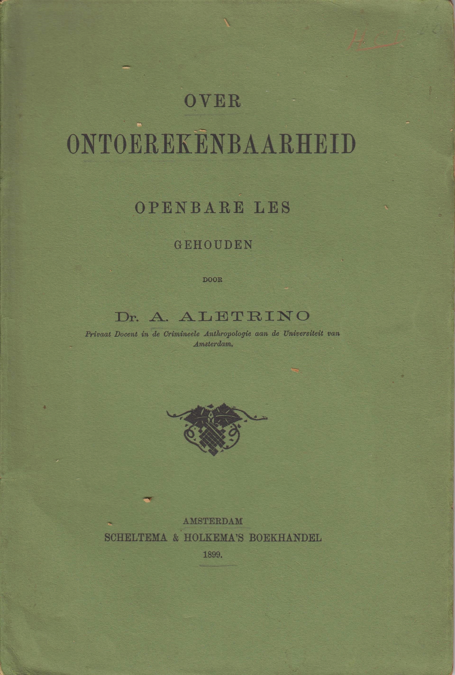 17. ALETRINO, A. Over ontoerekenbaarheid. Openbare les. Amsterdam, Scheltema & Holkema, 1899. Ingenaaid. 40 p. 1e druk. Rug aan onderzijde ingescheurd.