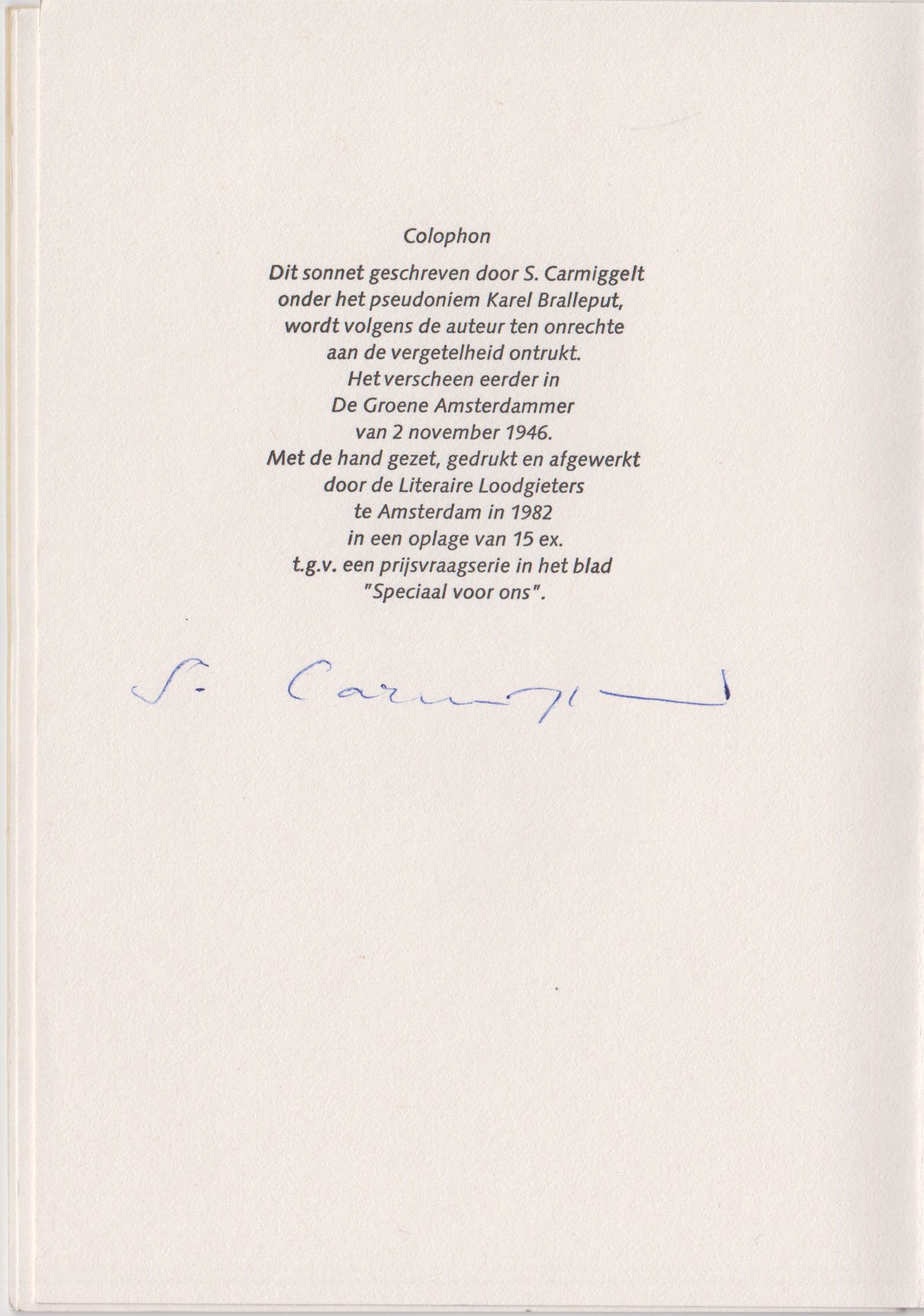 7. CARMIGGELT, S. Als: Karel BRALLEPUT Sonnet. (Amsterdam, De Literaire Loodgieters, 1982). 18,2 x 12,7 cm. Los in omslag. (8) p. Met de hand gezet en gedrukt in een oplage van 15 gesigneerde exemplaren. 1e druk.
