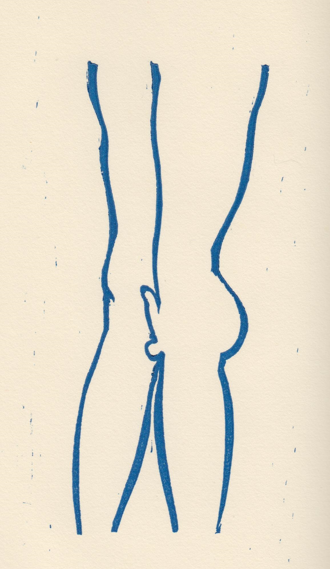 31. STEIN, Elliot Not Sex nor Ultimately Death. (Met een originele linosnede door Gerard Bruning). [Amsterdam], Sub Signo Libelli, 1979. Blauw linnen (Binderij Phoenix). (4), 20 p. Met de hand gezet uit de Monotype Fournier en gedrukt in blauw en zwart in een oplage van 45 genummerde exemplaren. Met het door Pam G. Rueter ontworpen exlibris van G.M. van Wees op de binnenzijde van het voorplat.