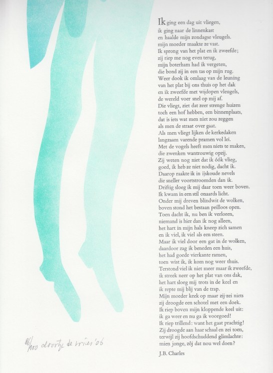 8. CHARLES, J.B. De Jongen Vliegt. (Met een genummerd en gesigneerd druksel door Doortje de Vries). (Apeldoorn, Eikeldoorpers, 2006). Uitvouwbare prent. Met de hand gezet uit de Bembo en gedrukt in een oplage van 100 genummerde exemplaren.