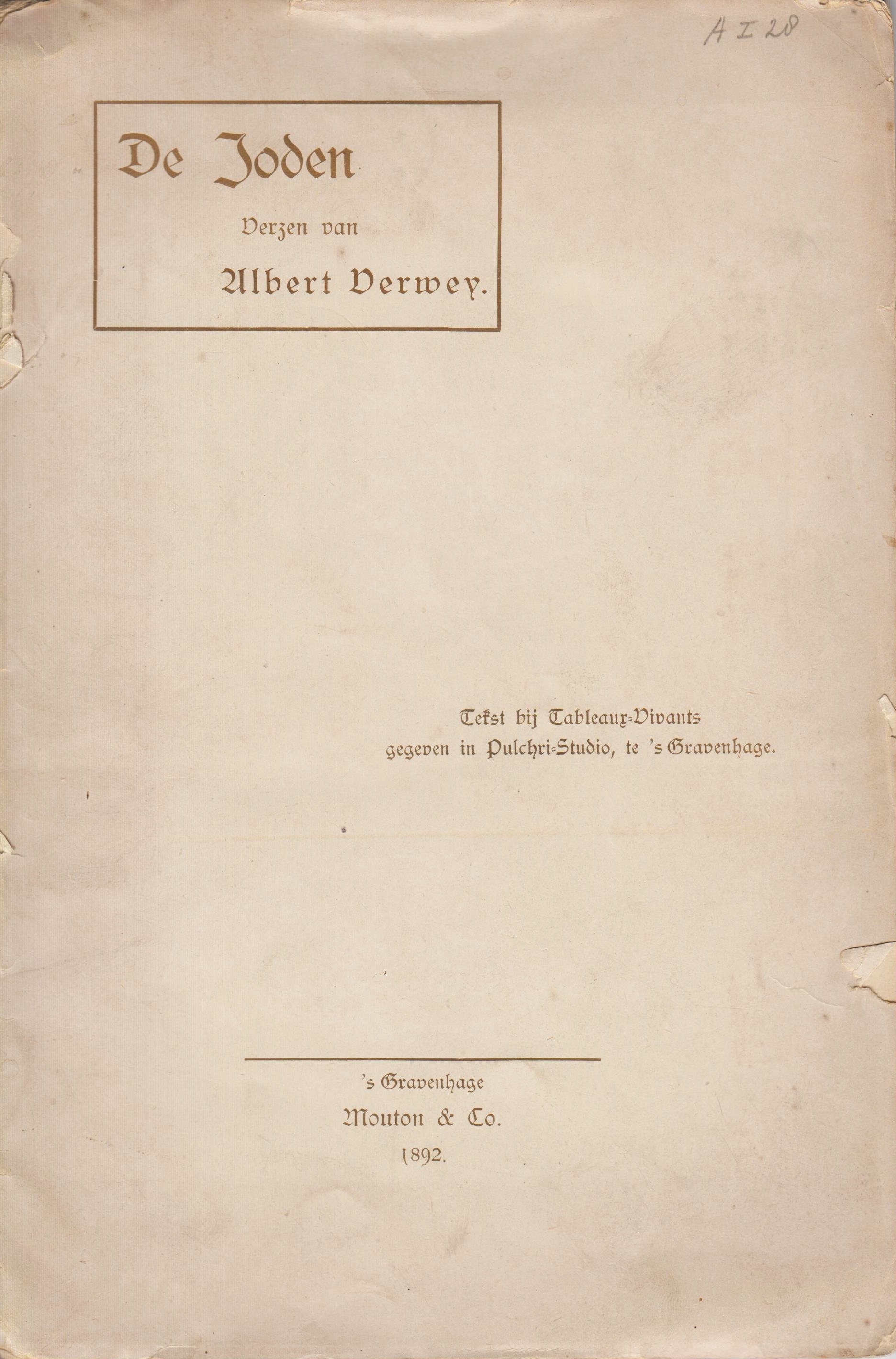 6. VERWEY, Albert De Joden. Verzen. (Omslag: ‘Tekst bij Tableaux-Vivants gegeven in Pulchri-Studio, te ‘s-Gravenhage’). (Met opdracht aan Lodewijk van Deyssel). Den Haag, Mouton & Co., 1892. Ingenaaid. 52 p. 1e druk. Met het originele glimmende omslag in redelijke staat: langs de randen ontbreken wat kleine hapjes, rug los.