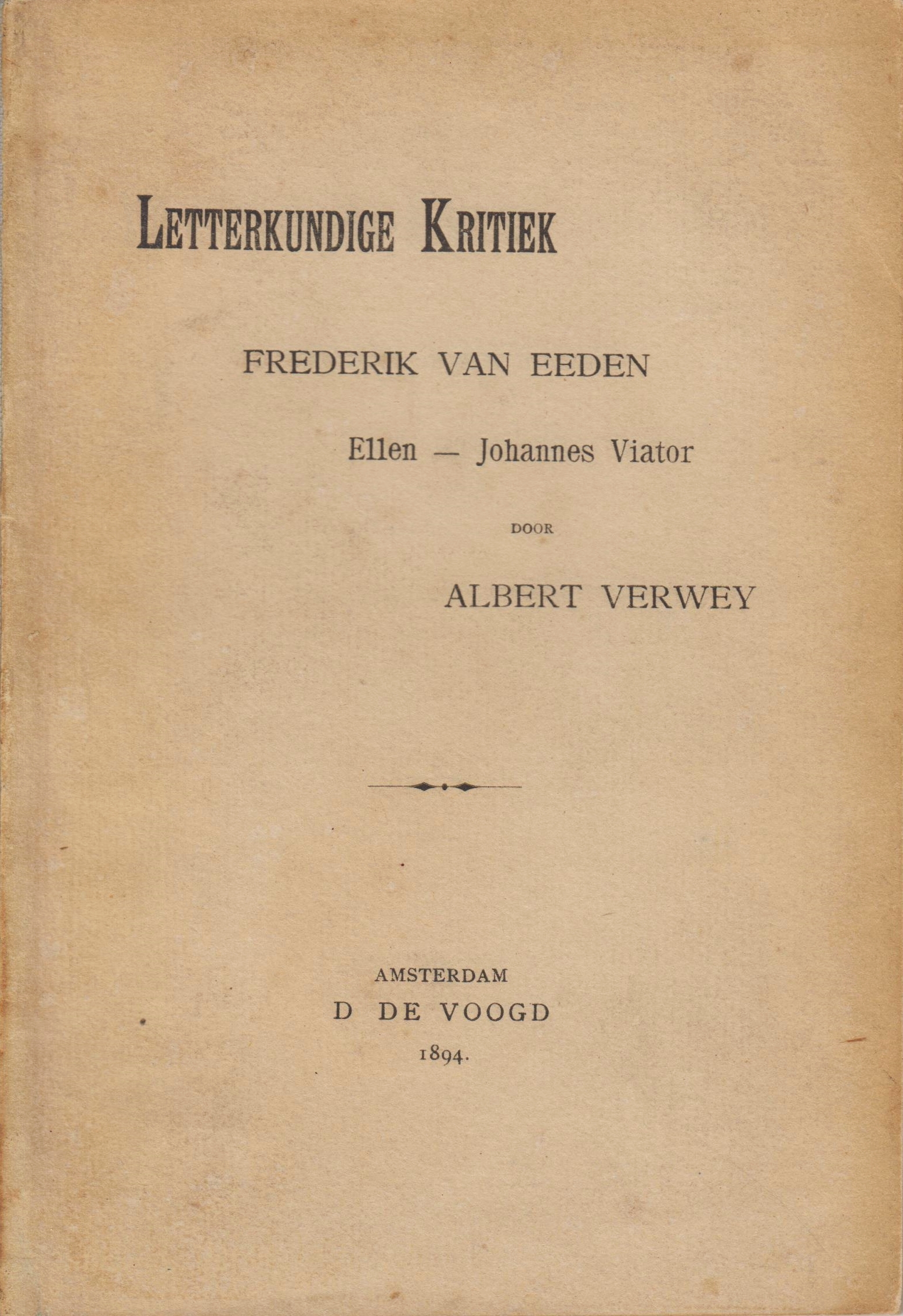 8. VERWEY, Albert Letterkundige kritiek. Frederik van Eeden. Ellen. Johannes Viator. Amsterdam, De Voogd, 1894. Ingenaaid. 68 p. 1e druk. Omslag en titelpagina wat gekreukt en iets gevlekt.