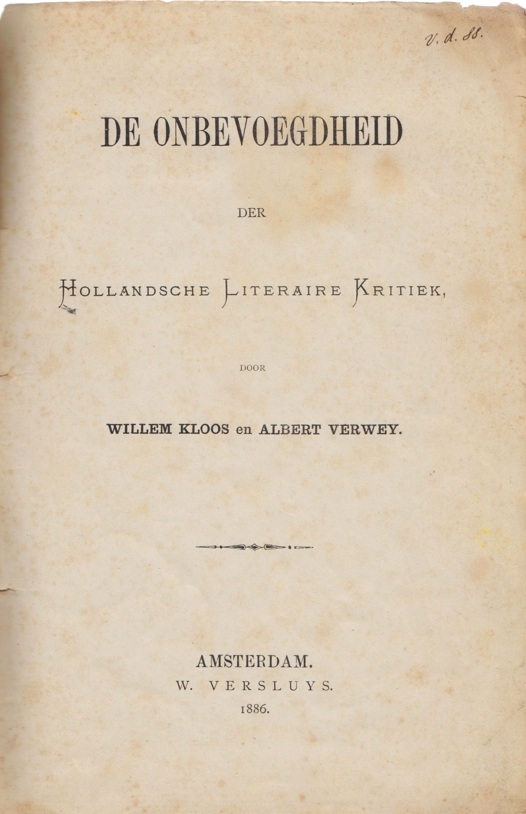 17. VERWEY, Albert en Willem KLOOS De onbevoegdheid der Hollandsche literaire kritiek. (Met opdracht). Amsterdam, Versluys, 1886. Ingenaaid. 48 p. 1e druk. Rug beschadigd en omslag vlekkerig.