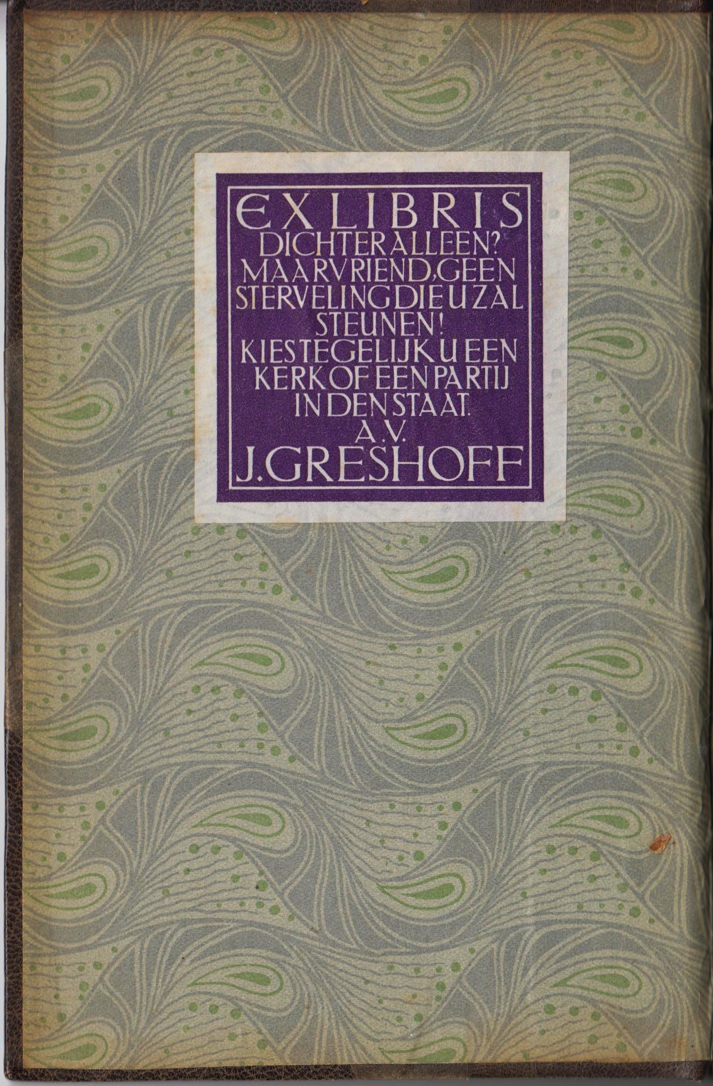 * Met (paars) exlibris van Greshoff, vervaardigd door Jan van Krimpen, waarop een lapidaire tekst van Albert Verwey: ‘Dichter alleen? Maar vriend, geen sterveling die u zal steunen! Kies tegelijk u een kerk of een partij in den staat.’ Nummer 4 van de ‘Nieuwe woorden’, voor het eerst gepubliceerd in De Beweging, 1912 (januari?).