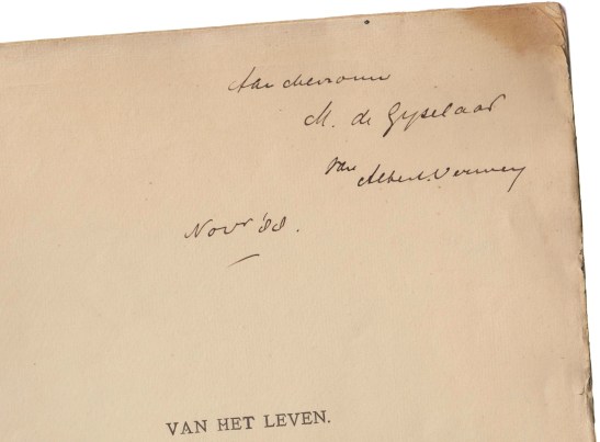 * Exemplaar met opdracht: ‘Aan Mevrouw/ M. de Gijselaar/ van/ Albert Verwey/ Nov. ’88’. Marie de Gijselaar (1859-1937) had Verwey in augustus 1888 leren kennen, toen deze een reisje maakte met zijn halfzuster. Zij dankte Verwey per brief voor dit exemplaar: ‘ik ben er erg blij meê en hoop dat je nu niet denken zult dat dit maar een beleefde frase is’.