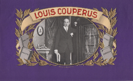 5. (COUPERUS, Louis) Dekblad voor een doos Louis Couperus-sigaren. Enkel blad. Oblong 15,3 x 25,3 cm. Midden jaren twintig. In druk nogal geretoucheerde foto van Couperus staand voor zijn boekenkast, een boek in de hand, in gouden parelrand onder een lint met zijn naam in rood en goud, gevat in een gouden lauwerkrans met boeken erin, te weten Eline Vere, Majesteit, Extaze en Orchideeën. Tegen een dieppaarse achtergrond geplaatst. Het goud is in reliëfdruk uitgevoerd. In fraaie staat.