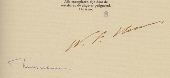 * Exemplaar met handgeschreven, gesigneerde opdracht van de auteur aan L. Novotný, gedateerd ‘3/3 1936’. Ook gesigneerd door Marcel Stobbaerts en A.A.M. Stols.