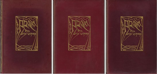 * Luxe-editie (‘Weelde-uitgave’) in heelleder met fraaie art-decobandstempeling. VV 320,4: ‘Het aantal luxe-exemplaren staat niet vast, maar zal niet veel meer dan enkele tientallen zijn geweest’. Het eerste deel van deze verzameling feuilletons werd samengesteld door Couperus zelf, die op 16 juli 1923 zou overlijden, de twee andere door zijn vrouw. Collectie Veen 1.2.