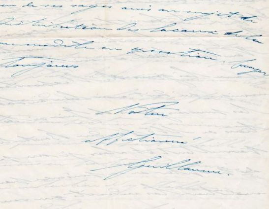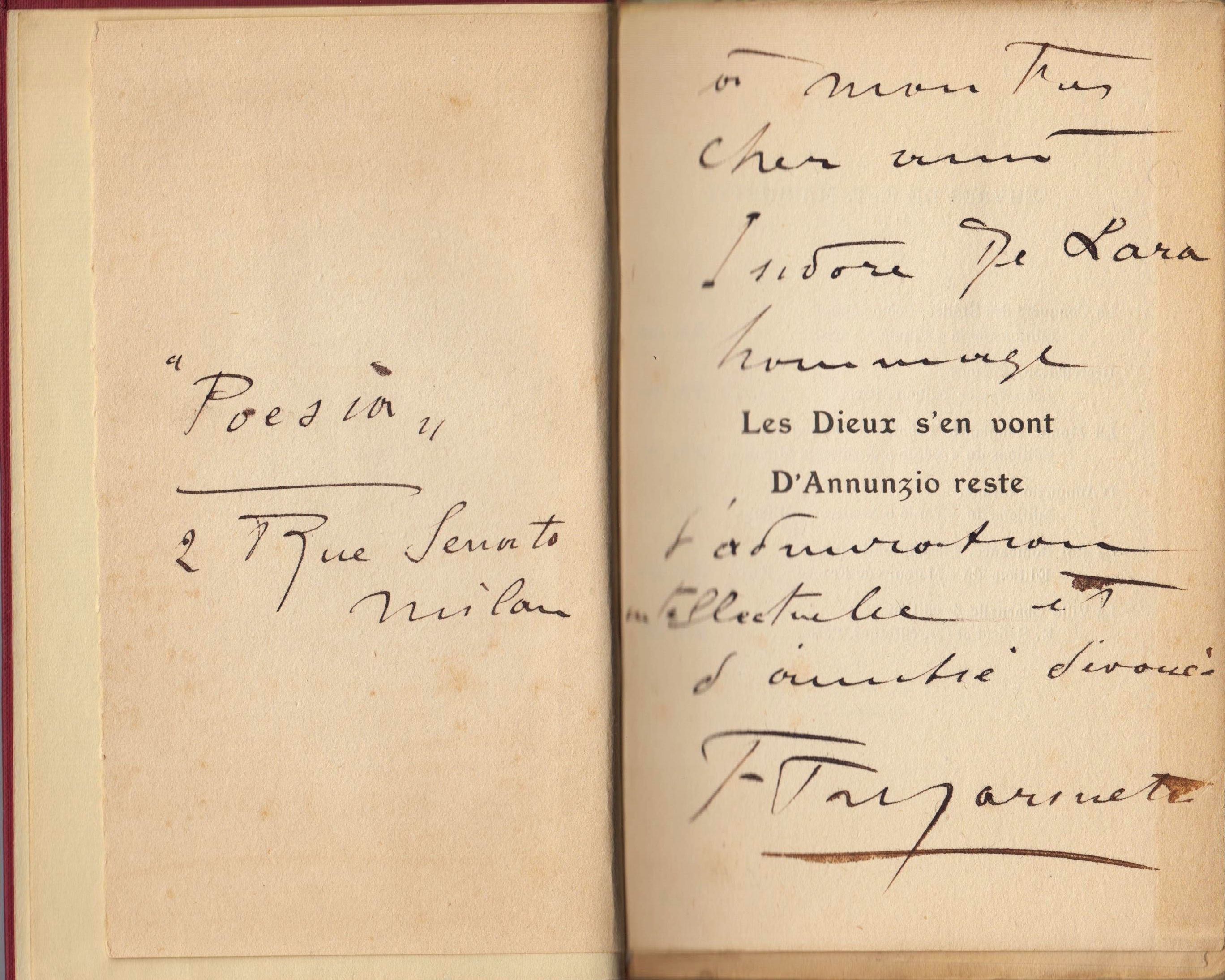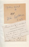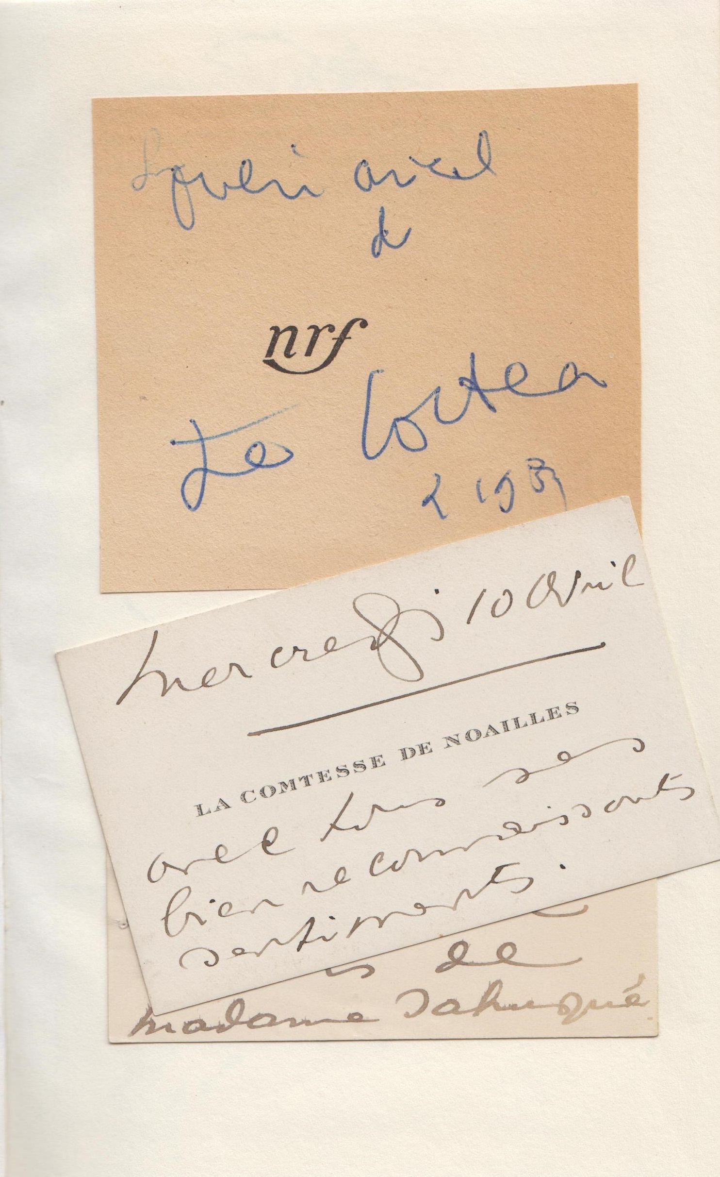 * Dit exemplaar is verrijkt met een ingeplakte handgeschreven, gesigneerde opdracht van Cocteau (uit een ander boek): ‘Souvenir amical’ met het jaar 1959, moeizaam geschreven. Daaronder is een (geperforeerd) visitekaartje van de Comtesse de Noailles ingeplakt, waarop zij schreef ‘demande bien vivement à Fémina les vers de Madame Sahuqué’. Blanche Sahuqué-Larronde (1860-1912) was een dichteres, geboren in Antwerpen. Een tweede visitekaartje, ook beschreven door de Comtesse, is bijgevoegd.