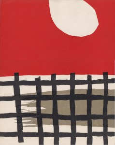 16 CONSTANT, & Jan ELBURG Het uitzicht van de duif. (Enkel vouwblad met originele houtsnede door Constant). (Amsterdam, Galerie Le Canard, 1952). 34,5 x 27,2 cm. Eén vouwblad, genummerd ‘4’. Met een originele kleurenhoutsnede door Constant. Gedrukt bij G.A. Verweij te Schiedam in een oplage van 129 exemplaren.
