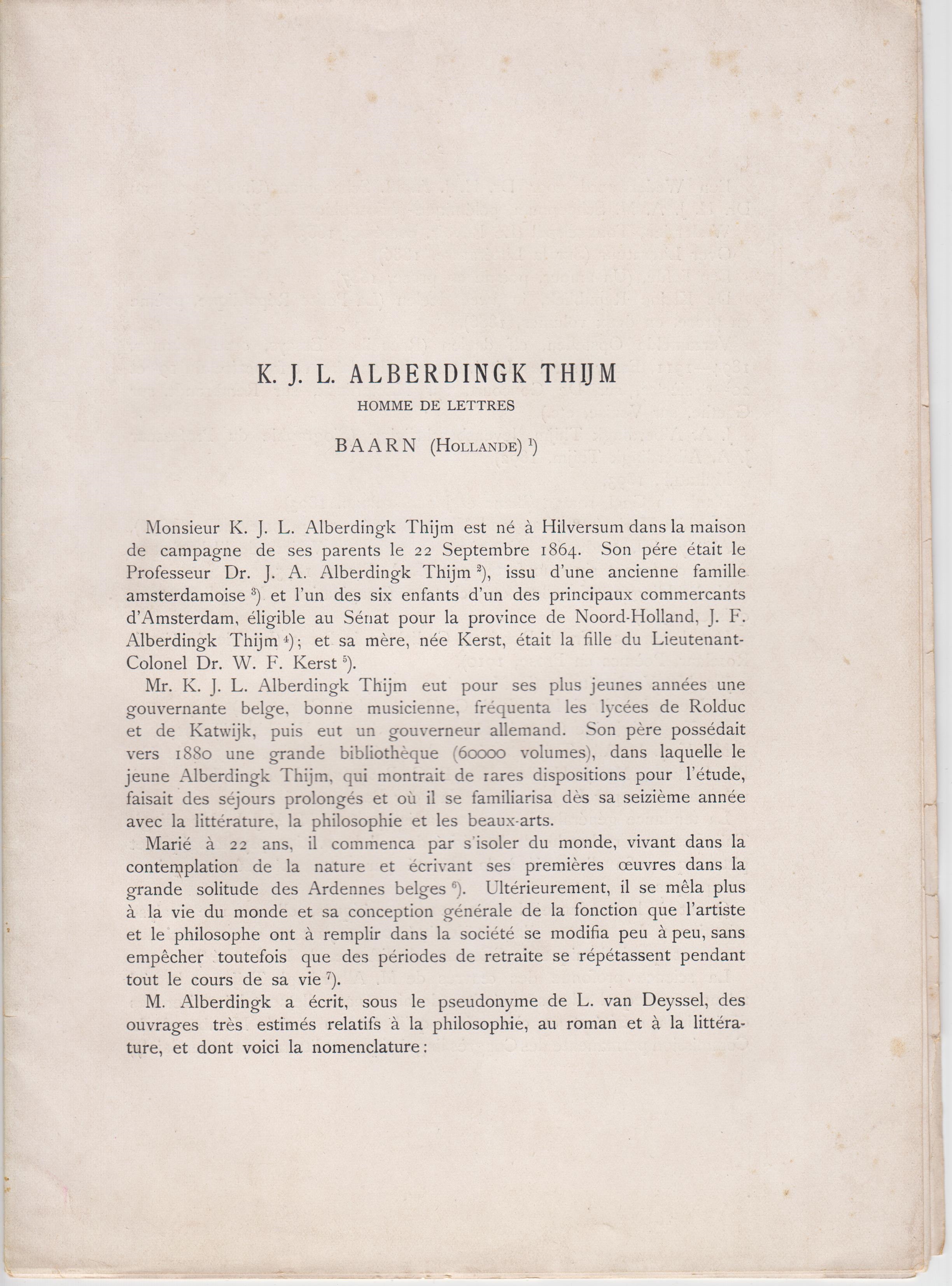 31 [DEYSSEL, Lodewijk van] K.J.L. Alberdingk Thijm. Homme de Lettres. Baarn (Hollande). [Baarn, eigen beheer, 1917]. Garenloos katern. 16 p. [Gedrukt in een oplage van 80 exemplaren]. 1e druk.