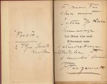 * Exemplaar met handgeschreven, gesigneerde opdracht van Slauerhoff op het schutblad: ‘Aan/ de verhevene/ Augusta/ aan de vooravond/ van een afscheid/ waarvan we hopen/ dat het niet voor/ eeuwig zij./ In Godsnaam – neen!/ Jan Slauerhoff/ 10 September [1916]’. Augusta Cornelia (Guusje) Slauerhoff (1900-1995) was het twee jaar jongere Zusje van de dichter, op wie hij zeer gesteld was, met wie hij altijd contact zou houden. In september 1916 zou Slauerhoff zijn geboortestad Leeuwarden verruilen voor Amsterdam, waar hij medicijnen ging studeren.