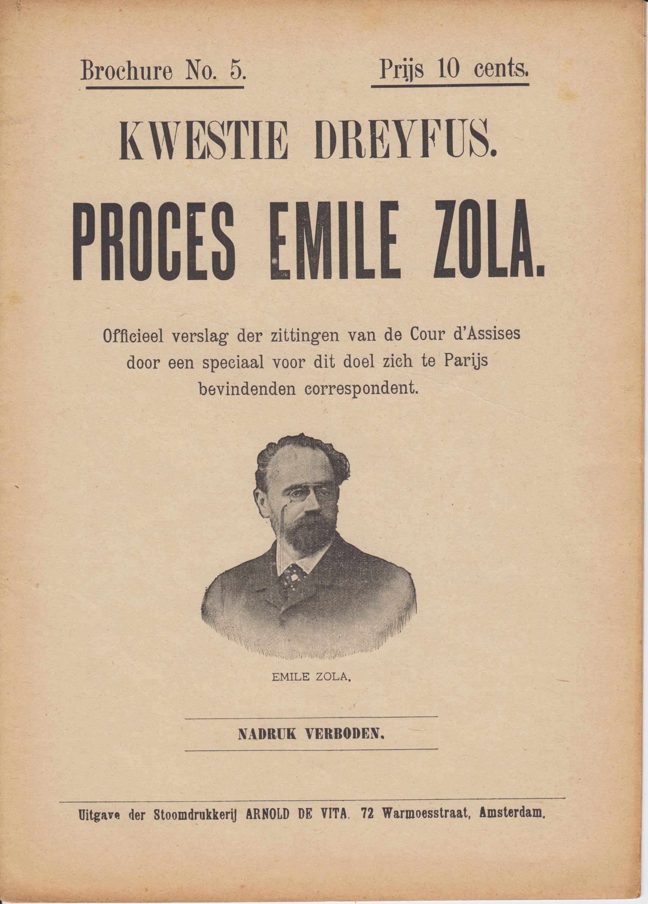 * Actualiteit waar je bij staat! Het verslag van het proces tegen Zola, van uw razende reporter te Parijs, Arnold de Vita (1860-1932). Toen je je filmpjes nog niet stante pede op YouTube kon zetten, was dit de manier. De Vita lardeert de uitvoerige verslagen van de 14 zittingsdagen met bezoekjes aan Zola zelf en de broer van Alfred Dreyfus, Matthieu. Van de hoofdrolspelers wordt ook het uiterlijk en de gunstige of ongunstige indruk beschreven – het is duidelijk bij wie De Vita’s sympathie ligt. Geruchten, de mening van het volk, beschouwingen over de toekomst, alles komt aan de orde. Een hoogst efemeer en historisch werk!
