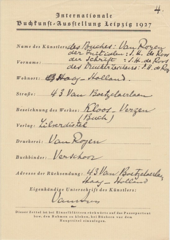 Bijgevoegd: een door Van Royen gesigneerd en ingevuld, voorgedrukt formulier van de Internationale Buchkunst-Ausstellung Leipzig 1927. Op het formulier noemt hij praktische zaken als de kunstenaars (‘Des Buches: Van Royen/ der Intitialen: S.H. de Roos/ der Schrift: S.H. de Roos/ des Druckerzeichens: S.H. de Roos), zijn naam, adres, binder etc. Van Royen heeft dit exemplaar blijkbaar ingezonden voor de tentoonstelling.