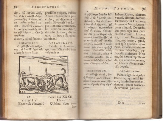 * Alleraardigste en zeer schaarse schooleditie van de fabelen van Aesopus in Grieks en Latijn, aangevuld met de Latijnse berijming van Avianus en de Batrachomyomachia in Grieks en Latijn. Met 48 mooie kleine houtsneden (plus een finis- en een eekhoornvignet en houtsnede-initialen). Geweldig leuk voor wie zin heeft zich weer eens in Latijn of Grieks te verdiepen!