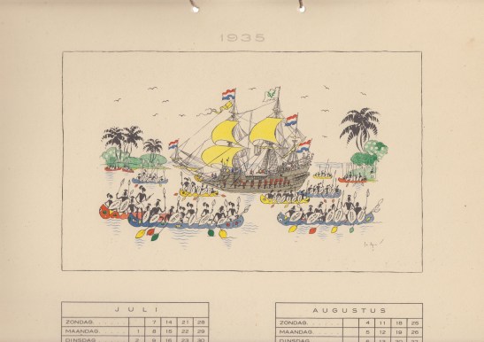 83 SPIER, Jo Kalender voor 1935. Haarlem, Oud & Co. Wijnkoopers, [1934]. Liggend formaat 28 x 32 cm. Genaaid met koord. 6 bladen (kalender voor 2 maanden met kleurentekening van een 17e-eeuws zeilschip in verschillende landen). 1e druk. In behoorlijk goede conditie.