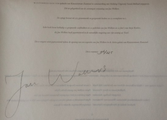 WOLKERS, Jan Winterbeelden. (Met 12 originele zeefdrukken van Jan Wolkers en 12 foto’s van Steye Raviez). [Zaandam], (Kunstcentrum Zaanstad, 1995). 33 x 52 x 3,5 cm. In linnen overslagdoos (Geert van Daal, Atelier De Distelkamp). Vervaardigd in een oplage van 250 genummerde en gesigneerde exemplaren.