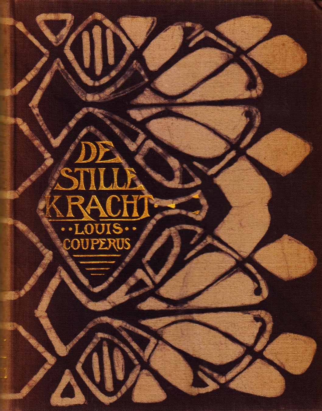 12. COUPERUS, Louis De stille kracht. (Originele batikband, ontwerp Chris Lebeau). Amsterdam, Veen, [1900]. Origineel gebatikt linnen met gouden belettering [ontwerp Chris Lebeau, de paarsbruine variant]. (4), 184, (4), 212 p. 1e druk. Rug en smalle strook voor- en achterplat (als altijd) wat verschoten. Twee hoekjes licht gebutst. Contemporaine naam op titel. Goed exemplaar.