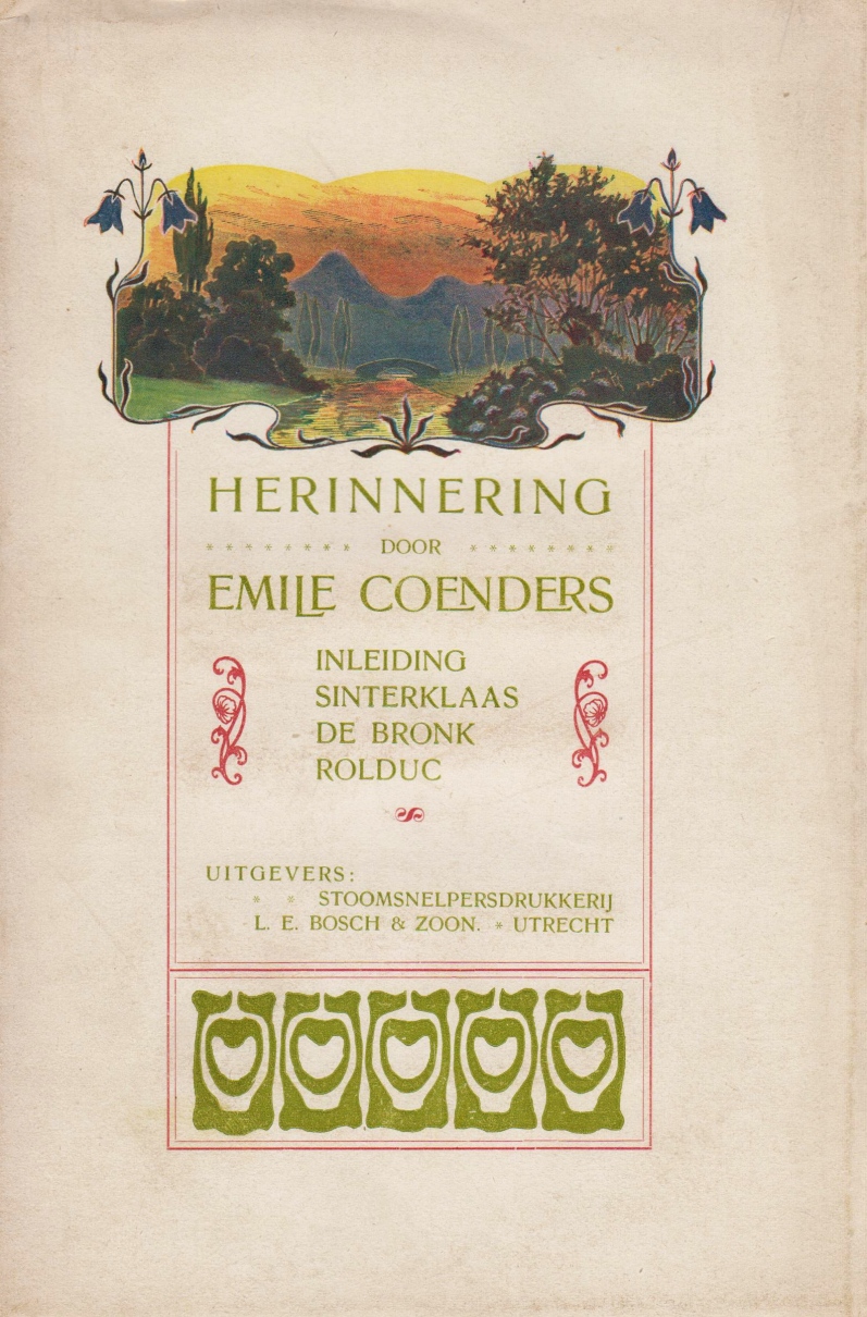 9. COENDERS, Emile Herinnering. Inleiding, Sinterklaas, De Bronk, Rolduc. Utrecht, Stoomsnelpersdrukkerij L.E. Bosch & Zoon, [1900]. Ingenaaid. 156 p. Tekst in bruin gedrukt, elke pagina tussen twee sierblokjes in violet. 1e druk. Teer boekje in zeer goede conditie.