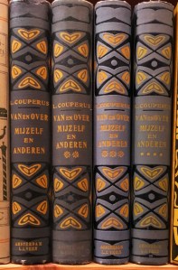 13. COUPERUS, Louis Van en Over Mijzelf en Anderen. (Eerste, tweede, derde en vierde bundel). Amsterdam, Veen, [1910-1917]. Vier delen. Linnen (ontwerp W.J. Taanman). (8), 220; XVI, 92, (2), 100; (8), 184; 184 p. 1e druk. Nette (samengestelde) set, met zoals altijd lichte kleurafwijking: voor de eerste twee delen is een donkerder en gladder soort linnen gebruikt.