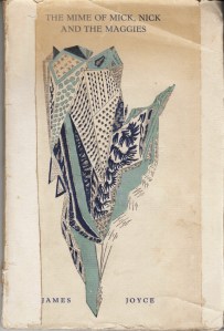 30. JOYCE, James The mime of Mick, Nick and the Maggies. A fragment from Work in Progress. Den Haag, The Servire Press, 1934. Ingenaaid. (8), 80 p. Niet afgesneden. Initiaal, vignet en omslag ontworpen door Lucia JOYCE. Titel in rood en zwart. Gedrukt in 1029 genummerde exemplaren. 1e druk. Zeer matig exemplaar, afkomstig uit een bibliotheek: voorzijde omslag uitgesneden en aangevuld aan de randen (zie afbeelding). De voorflap is aanwezig, maar de achterflap niet. Sporen van oud verwijderd stempel op titel. Wat vlekjes. Van binnen in goede staat.