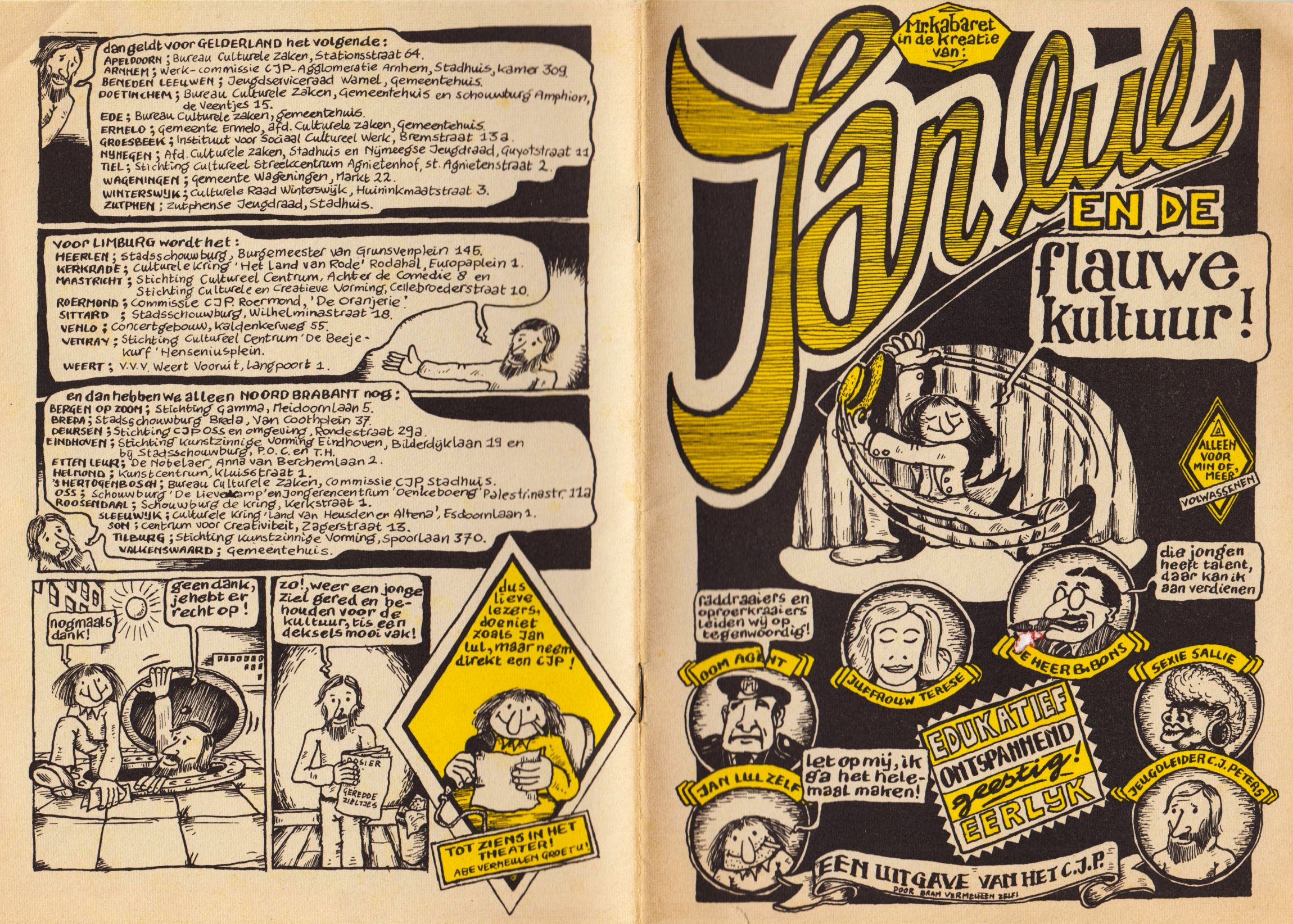 * Reclame voor het CJP, geheel in stripvorm getekend door de cabaretier Bram Vermeulen. Veel protest wegens vorm en taal zorgden voor weigering en wegwerp – zeldzaam daardoor!