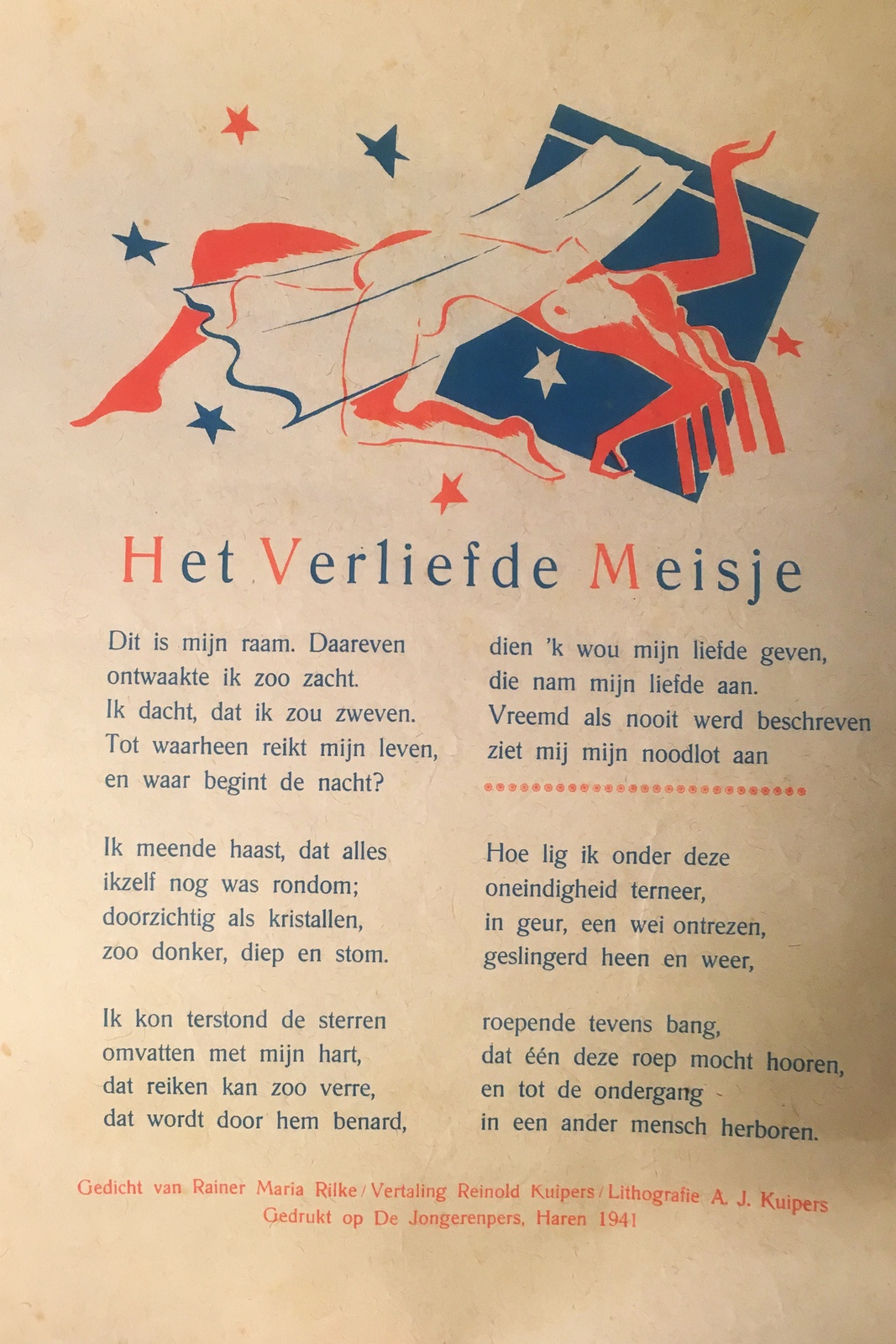 38. RILKE, Rainer Maria Het verliefde meisje. (Vertaling Reinold KUIPERS). Haren, De Jongerenpers, 1941. 41 x 28 cm. Rijmprent, eenzijdig bedrukt in groen en oranjerood op getint papier met Japans watermerk. Met een lithografie van Abe J. Kuipers. 1e druk. Prima staat.