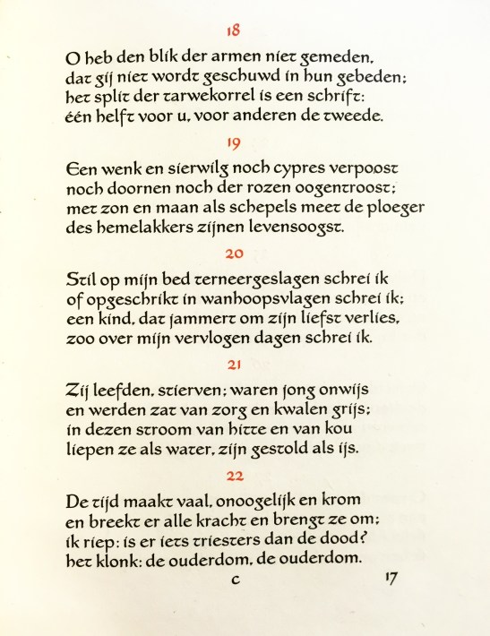 * Dit exemplaar is met de hand genummerd (’17’). Met in twee kleuren gedrukt prospectus, tevens een toelichting op de serie Ursa Minor, waarvan dit boek het eerste deel is. Op het prospectus een afdruk van het door John Buckland Wright ontworpen en in hout gesneden drukkersmerk met de Kleine Beer. Ook met een (roze) prospectus voor de in 1938 verschenen tweede druk van de dichtbundel (4 p.).